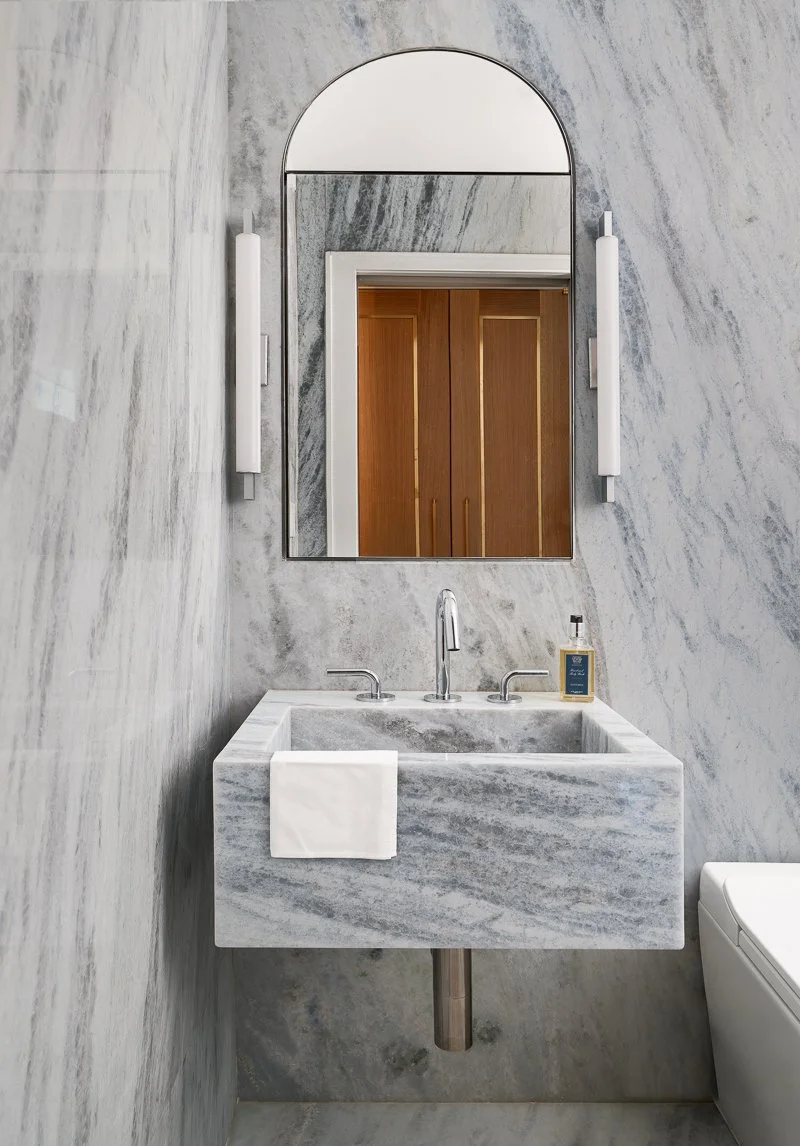 This bathroom is made of Calcite Azul Quartzite slabs, floor to ceiling, the floor itself and custom sink. Executed to perfection and makes a typical 5x8 bathroom feel large!! We used the same calcite Azul slab to create a custom sink for the second bath. Installed and executed to perfection under the arched medicine cabinet and a minimal set of lavatory faucet.